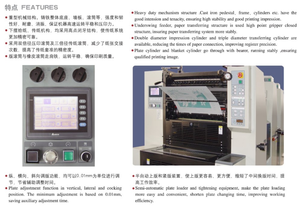 Når det kommer til den store A3-firefarve-kortoplagspresse, er den bygget med højtydende moduler, der gør den pålidelig – perfekt til kortvarige udskrivningsopgaver. Disse moduler inkluderer højpræcisionsruller og -gear, en robust papirfremføringsmekanisme, et præcist papirregistreringssystem og et stabilt blækforsyningssystem. Det opfylder markedets behov for farveudskrivning af klippeark, der er høj kvalitet, effektiv og omkostningseffektiv, især til kortvarige job. Den kan håndtere en bred vifte af papirtykkelser - fra 0,04 mm tyndt papir til 0,4 mm tykt pap. Og med dens touchscreen-kontrol og intuitive programmeringsgrænseflade kan du nemt foretage smarte justeringer af alle indstillinger og udskrivningsparametre.